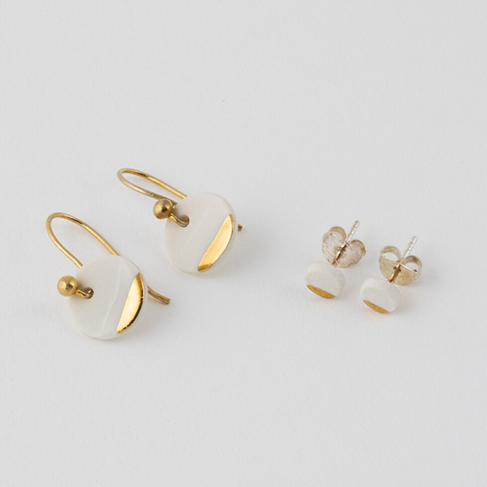 Favorecedores pendientes modelados a mano elaborados con porcelana blanca, decorados con esmalte y oro cerámico. El diseño de estas piezas tan ligeras como luminosas aportan viveza. Disponibles montados en clavo o en gancho de plata de Ley 925. Escoge tu opción preferida.